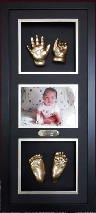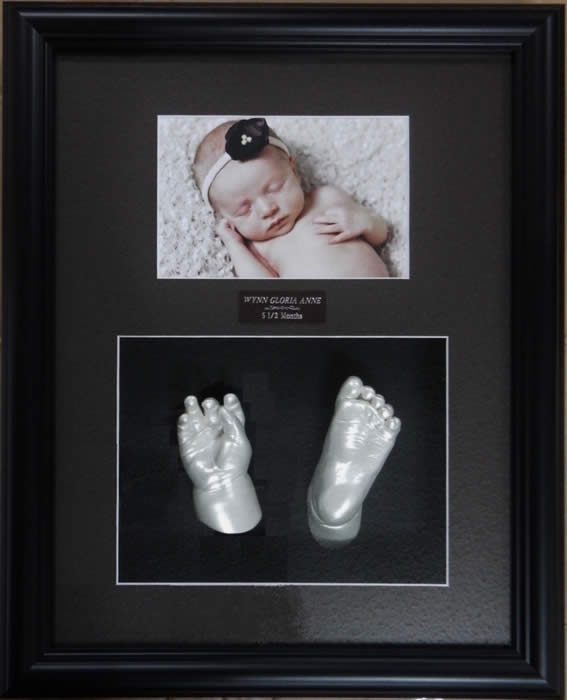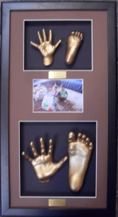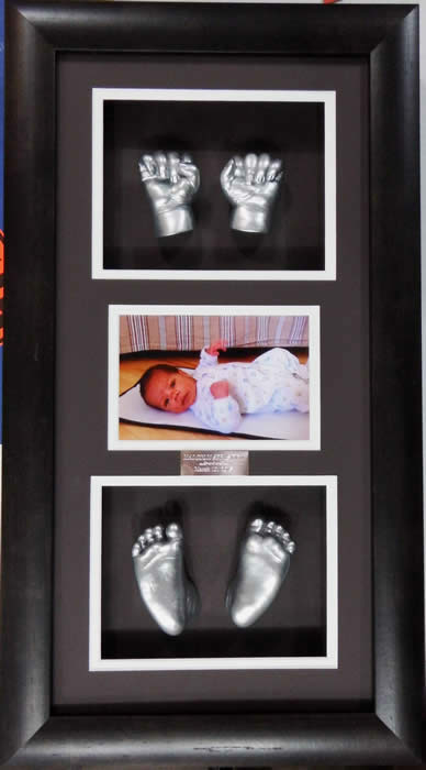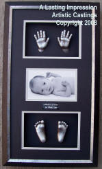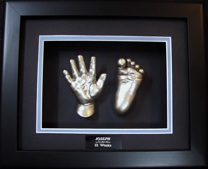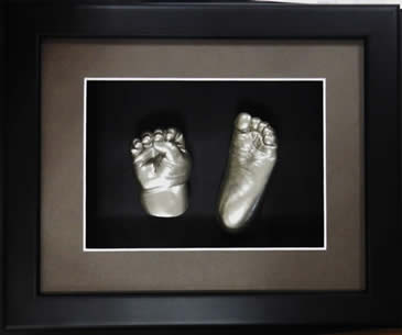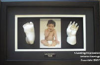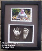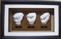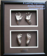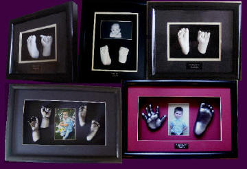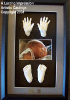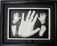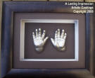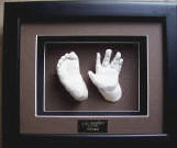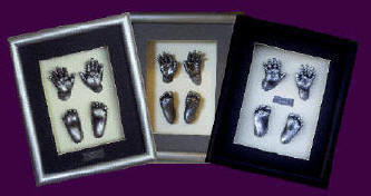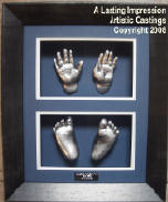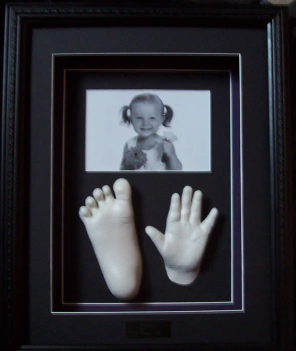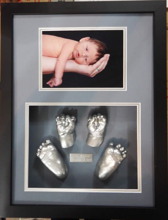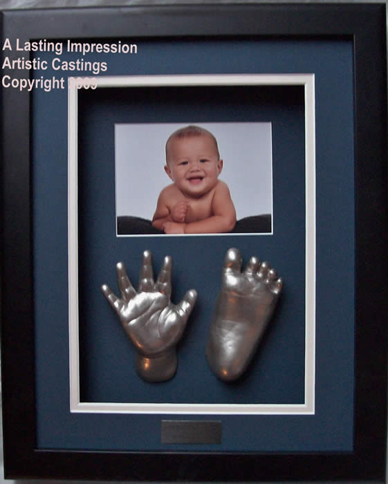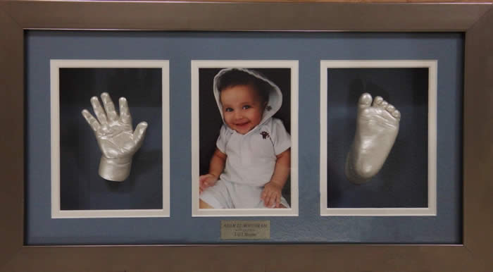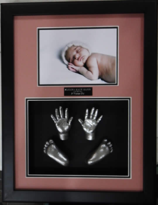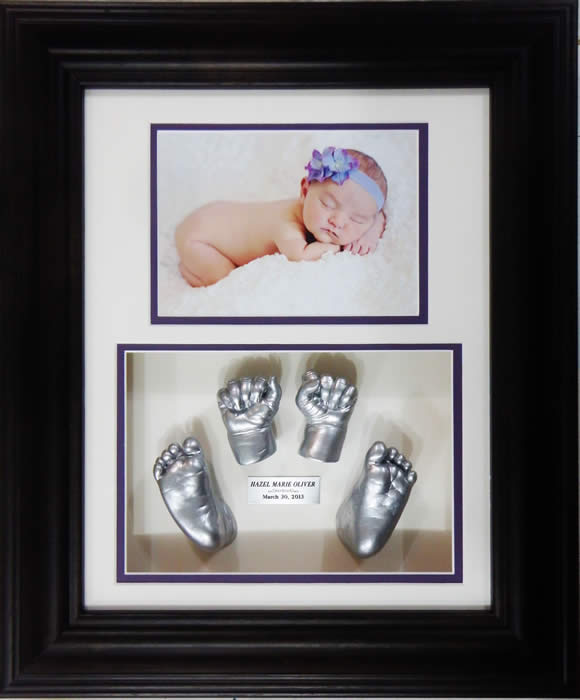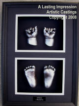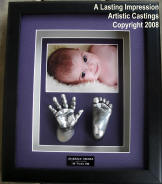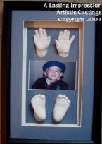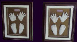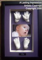More About our Materials We have many shadow box mouldings to choose from, depending on how big your child is and how they position their hands or feet. 1 inch to 3 inches in depth, which means that we can put a large part of your Childs hand or foot in the box, without cutting out any precious wrinkles or creases. We use 100% Acid free mats (museum archival quality) and many colour combinations are available. Peterboro Conservation Matboards. The backings are either hand painted using premium artist paints or our acid free mats. There is not much we can not do, any size frame and combination of pictures and castings, including siblings together is available. We have many samples on display in our studio and many more for you to choose from our Portfolio and your imagination.