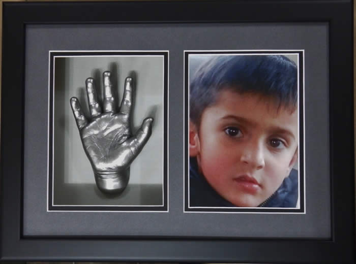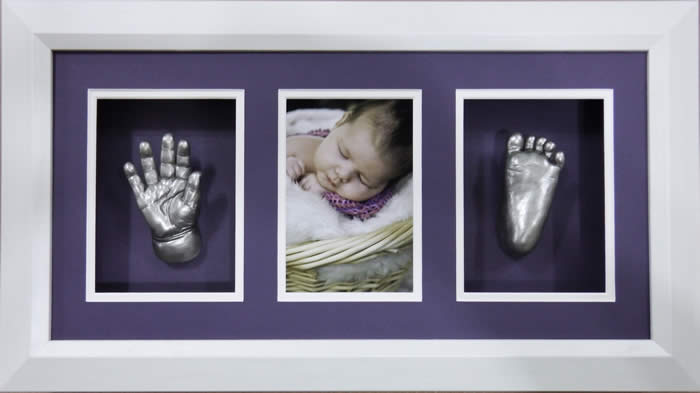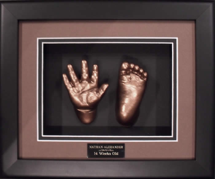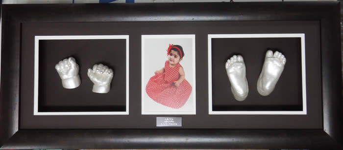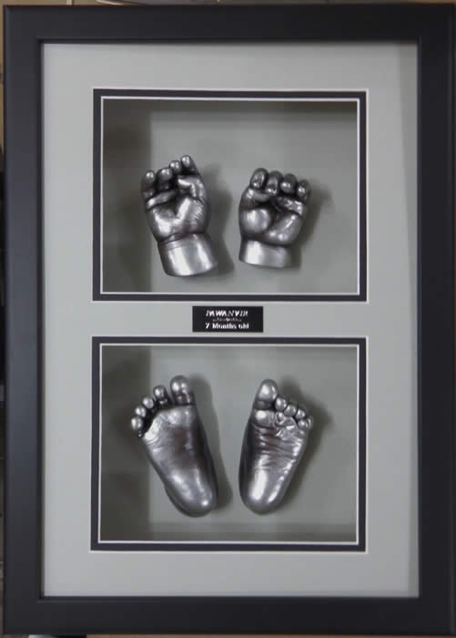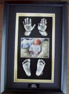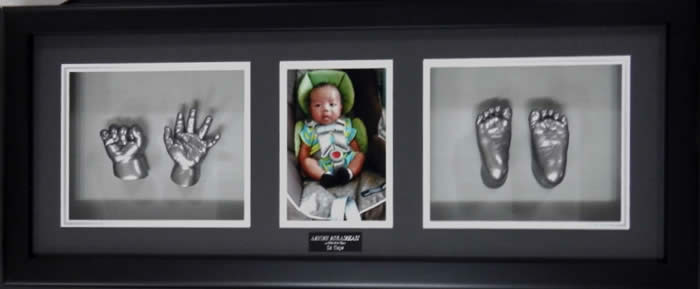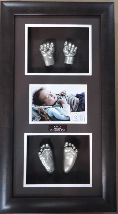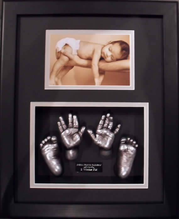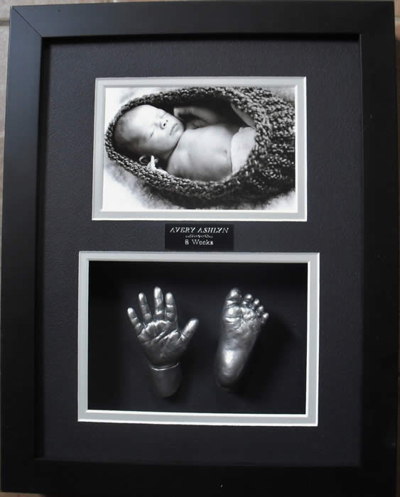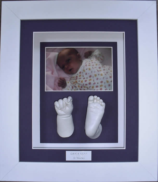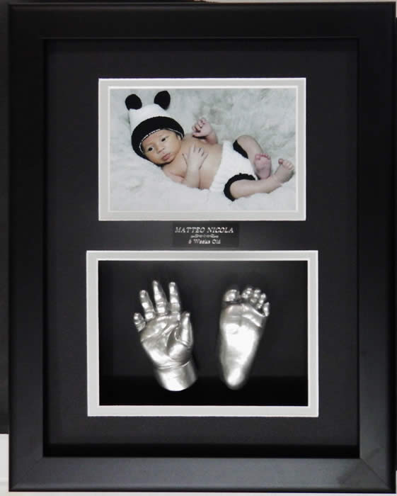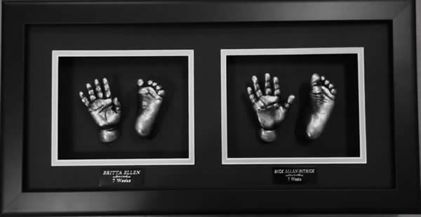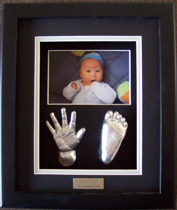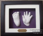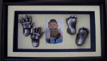 More About our Materials We have many shadow box mouldings to choose from, depending on how big your child is and how they position their hands or feet. 1 inch to 3 inches in depth, which means that we can put a large part of your Childs hand or foot in the box, without cutting out any precious wrinkles or creases. We use 100% Acid free mats (museum archival quality) and many colour combinations are available. Peterboro Conservation Matboards. The backings are either hand painted using premium artist paints or our acid free mats. There is not much we can not do, any size frame and combination of pictures and castings, including siblings together is available. We have many samples on display in our studio and many more for you to choose from our Portfolio and your imagination.